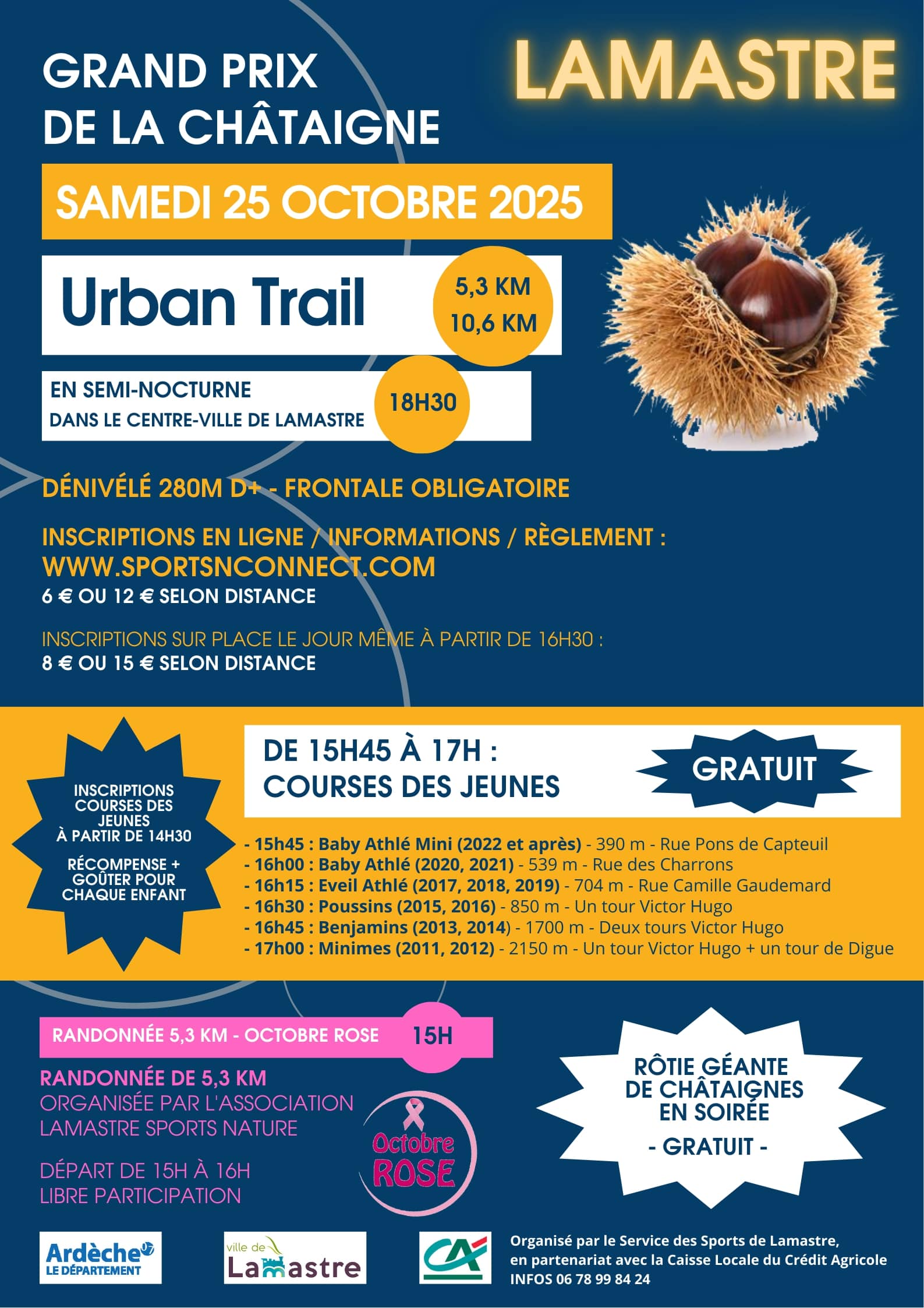 L'Urban Trail en semi-nocturne, rendez-vous des amateurs de la discipline. Les enfants ne sont pas en reste avec leurs propres courses. Randonnée dans le cadre d'Octobre Rose. Rôtie de châtaignes géante en fin de soirée.