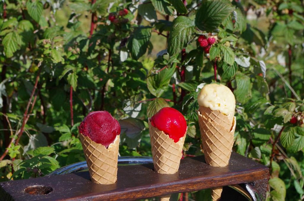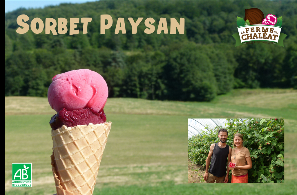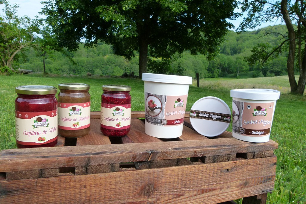 A la ferme du Chaléat on cultive en agriculture biologique des petits fruits rouges (fraises, framboises, cassis...) et des châtaignes. Ces fruits sont transformés sur place par Brice et Mathilde en délicieux sorbets, confitures, coulis...