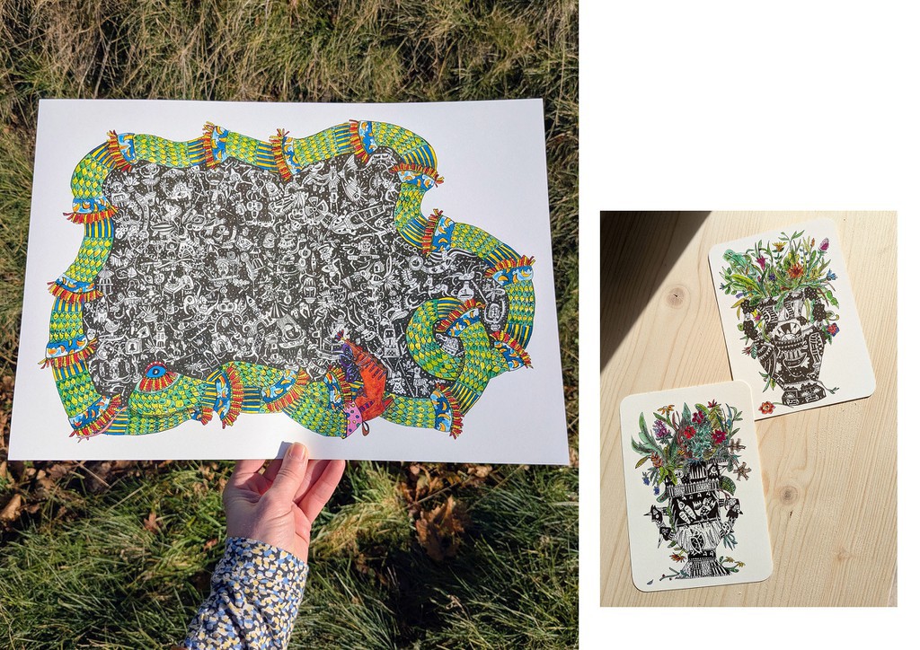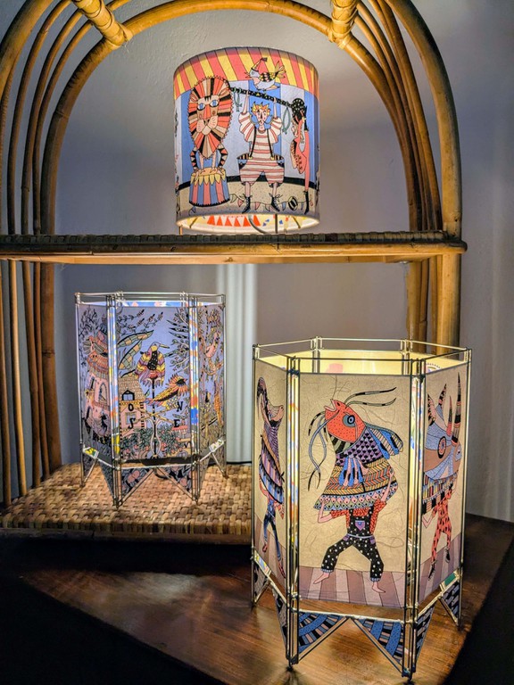 Atelier d'artiste avec un espace d'exposition présentant des illustrations et des lampes.