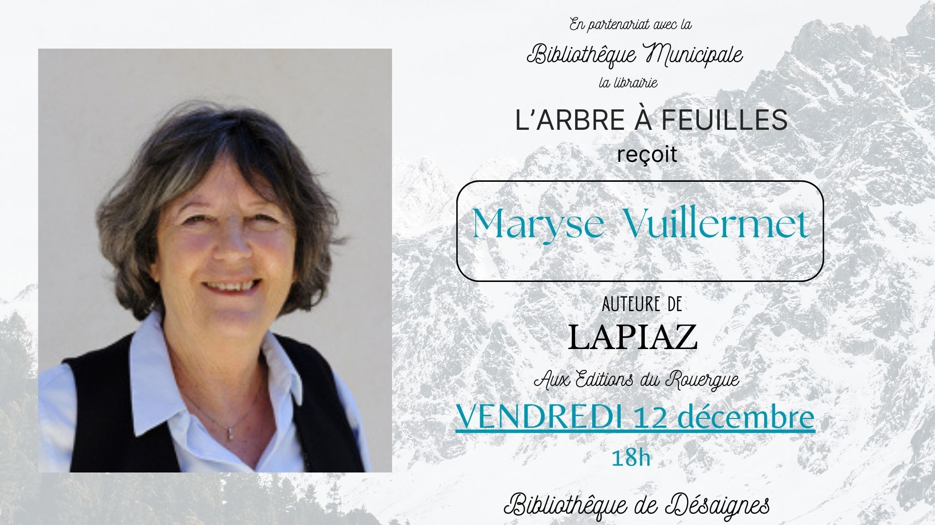 La librairie l'arbre à feuilles, en partenariat avec la bibliothèque de Désaignes reçoit Maryse Vuillermet, auteure de "Lapiaz" aux éditions du Rouergue.