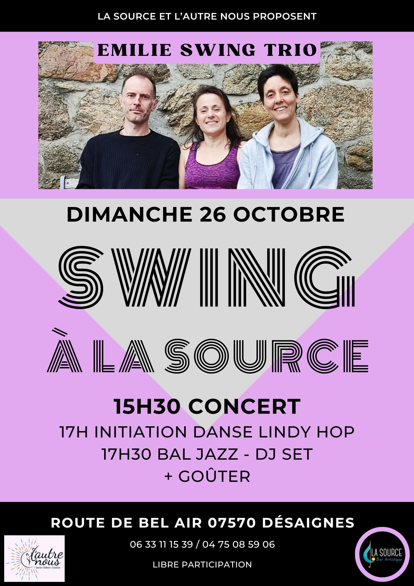 Au programme de cet après-midi festif à La Source : concert du Émilie Swing Trio, initiation à la danse lindy hop, bal jazz avec DJ set, et goûter convivial. Venez Swinguer et vous défouler !